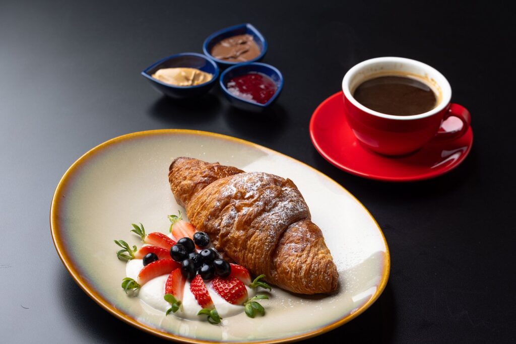 We were full but there was no way we were leaving without dessert. Enter the Pain Perdu — hot from the griddle, stuffed with creamy vanilla custard, topped with poached pears, and drizzled with tart berry sauce. It was soft, sweet, a little tangy, and basically the hug you didn’t know you needed.