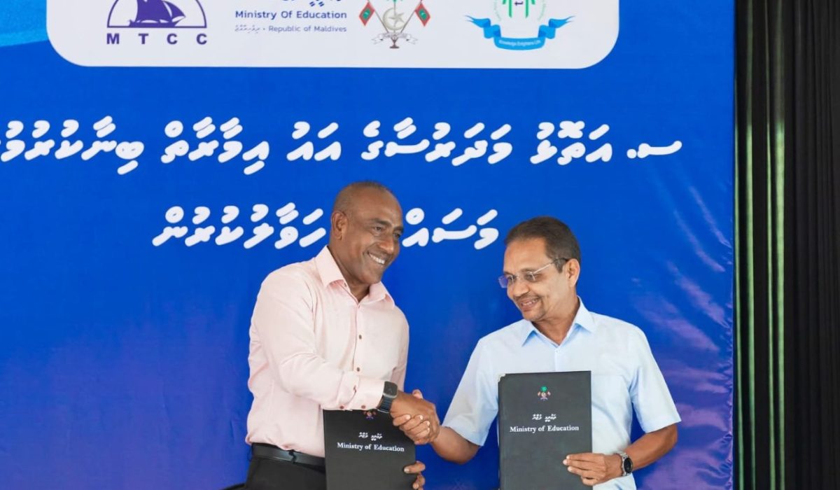 The contract was officially signed during President Dr. Mohamed Muizzu’s ongoing visit to Addu City. Minister of State for Education Hussain Saeed Mohamed signed on behalf of the Ministry, while MTCC was represented by Managing Director Ahmed Saud.
